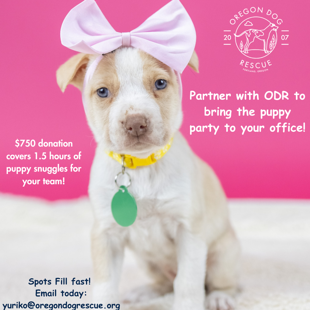 Want a fun, meaningful way to bring your team together? Host an office puppy party! Oregon Dog Rescue will visit your workplace for a 90-minute session, giving your team the chance to relax, recharge, and snuggle some adorable, adoptable puppies.